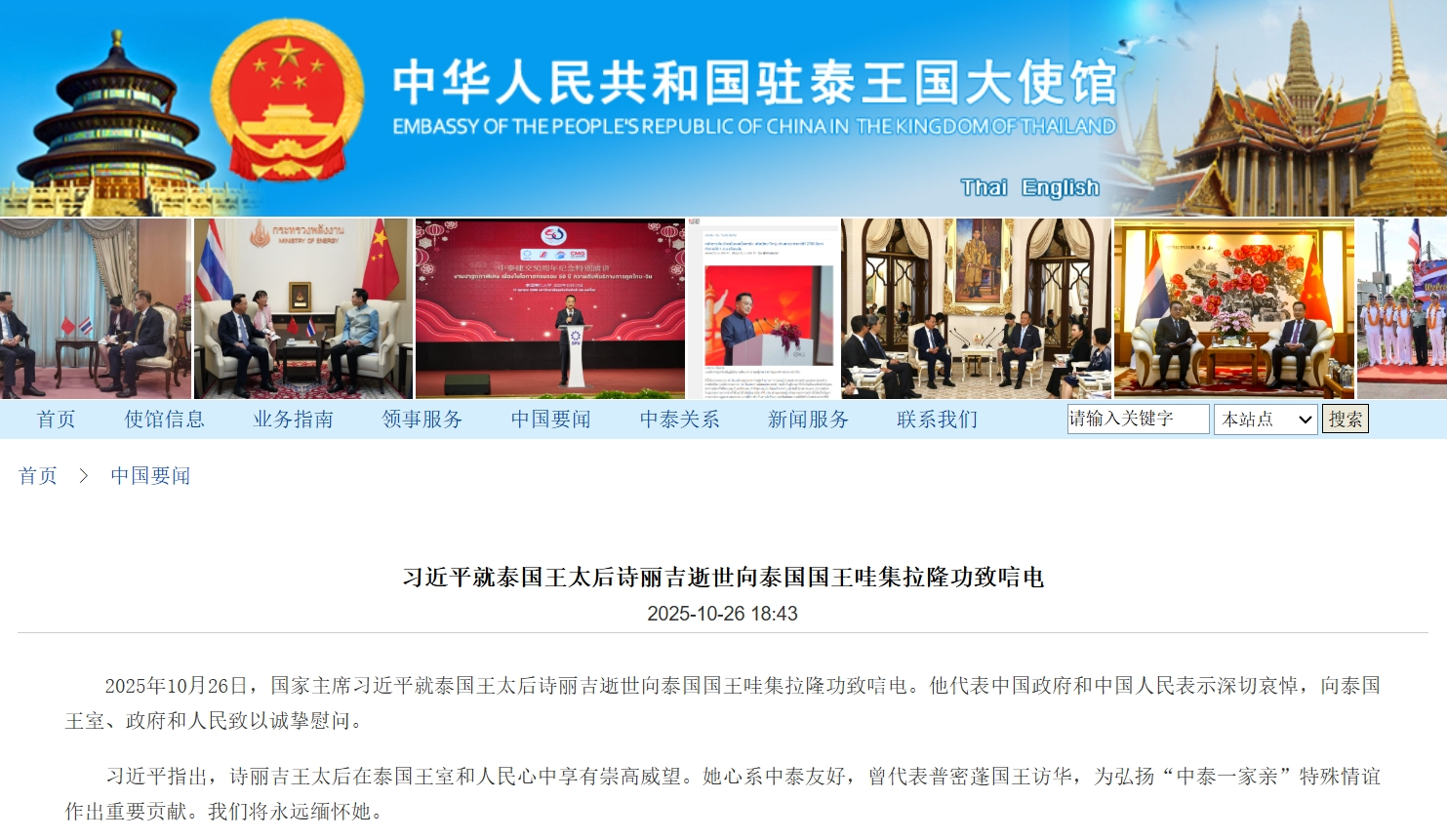 2025年10月26日,国家主席习近平就泰国王太后诗丽吉逝世向泰国国王哇集拉隆功致唁电。他代表中国政府和中国人民表示深切哀悼,向泰国王室、政府和人民致以诚挚慰问。