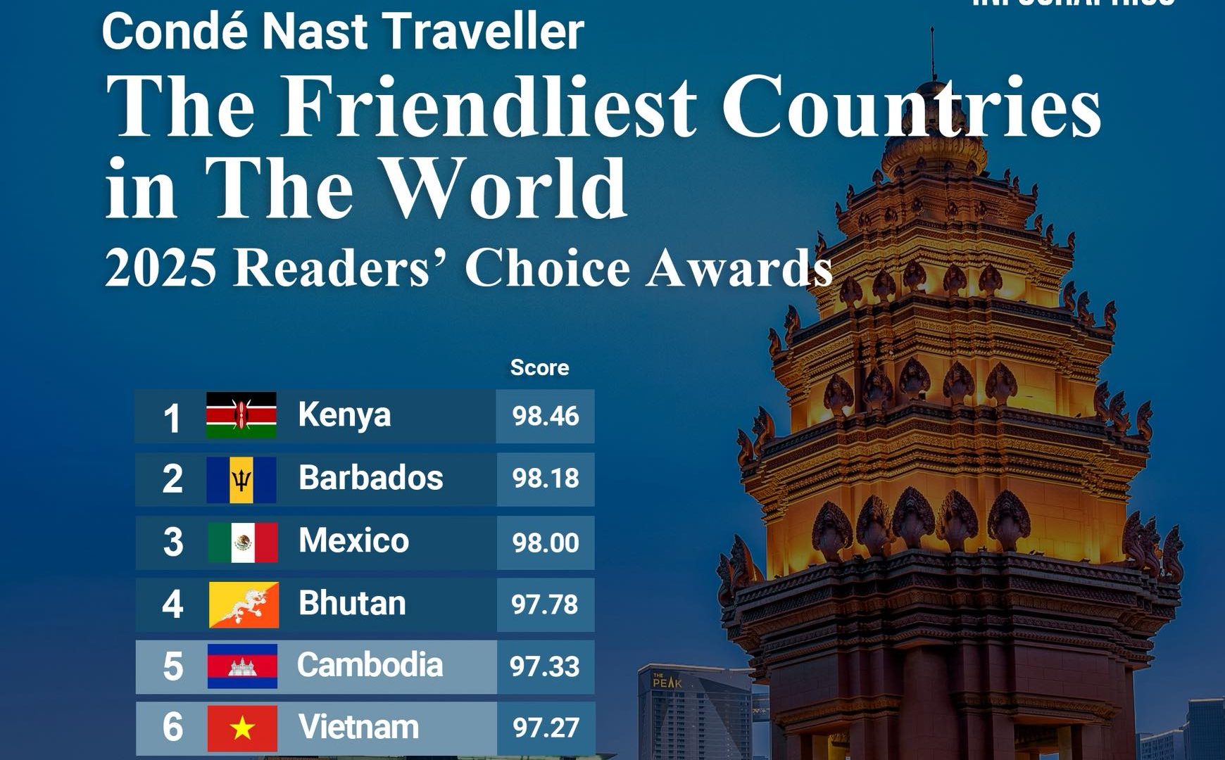 根据《康泰纳仕旅者》2025年读者之选大奖(Readers’ Choice Awards)结果,东南亚地区再度以其热情好客赢得全球赞誉——柬埔寨名列全球第5位,越南第6位,而泰国则并列第8位,跻身“全球最友好国家”前十名。