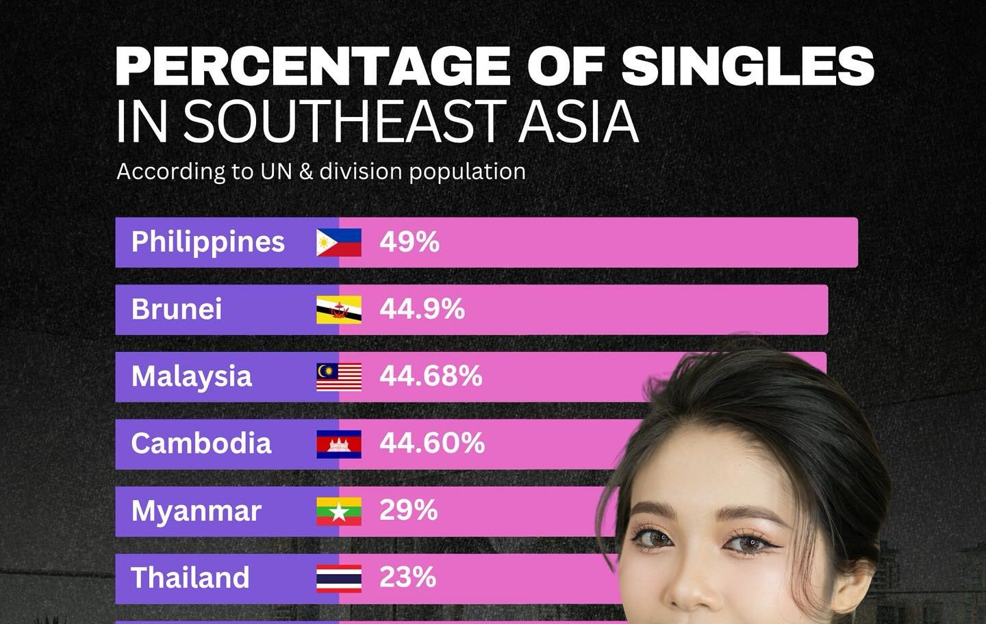 根据联合国及其人口统计部门最新发布的数据,菲律宾以49%的未婚人口比例位居东南亚首位,成为该地区“单身人口最多”的国家。其次是文莱(44.9%),马来西亚(44.68%)与柬埔寨(44.60%)几乎持平,缅甸以29%位居第五。