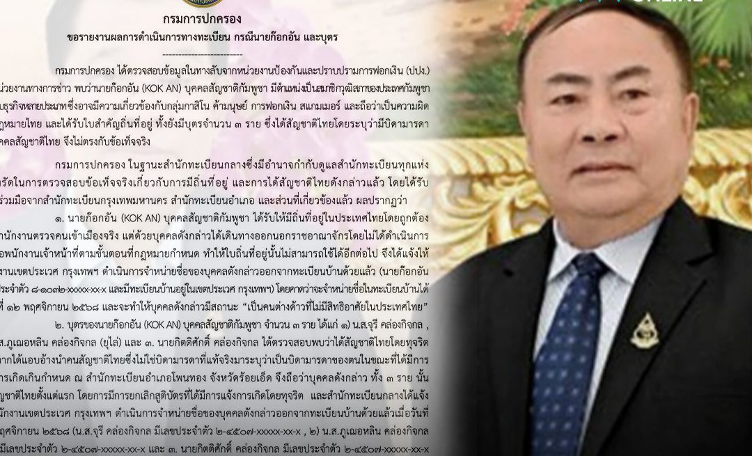 据泰国内政部辖下的地方行政厅(DOPA)通报,此案由该厅与反洗钱办公室(AMLO)及情报机构联合秘密调查。调查发现,郭安作为柬埔寨参议员,涉及多项商业活动,并被怀疑与赌场经营、人口贩运、洗钱及电信诈骗等非法行为有关。郭安曾获泰国移民局批准颁发居留证,但其后离境时未依法通报,致使居留证自动失效。内政部已指示曼谷巴威区将郭安从户籍登记中除名,正式认定其为“无居留权外国人”。