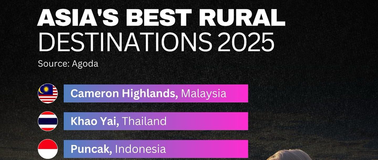 东南亚在此排名中表现强势,前3名均来自本区域。各地皆以独特魅力吸引游客:马来西亚金马仑高原的殖民气息、泰国考艾的国家公园与葡萄园景致、印尼朋加的清新山风,共同展现东南亚丰富多元的乡村文化与自然资源。