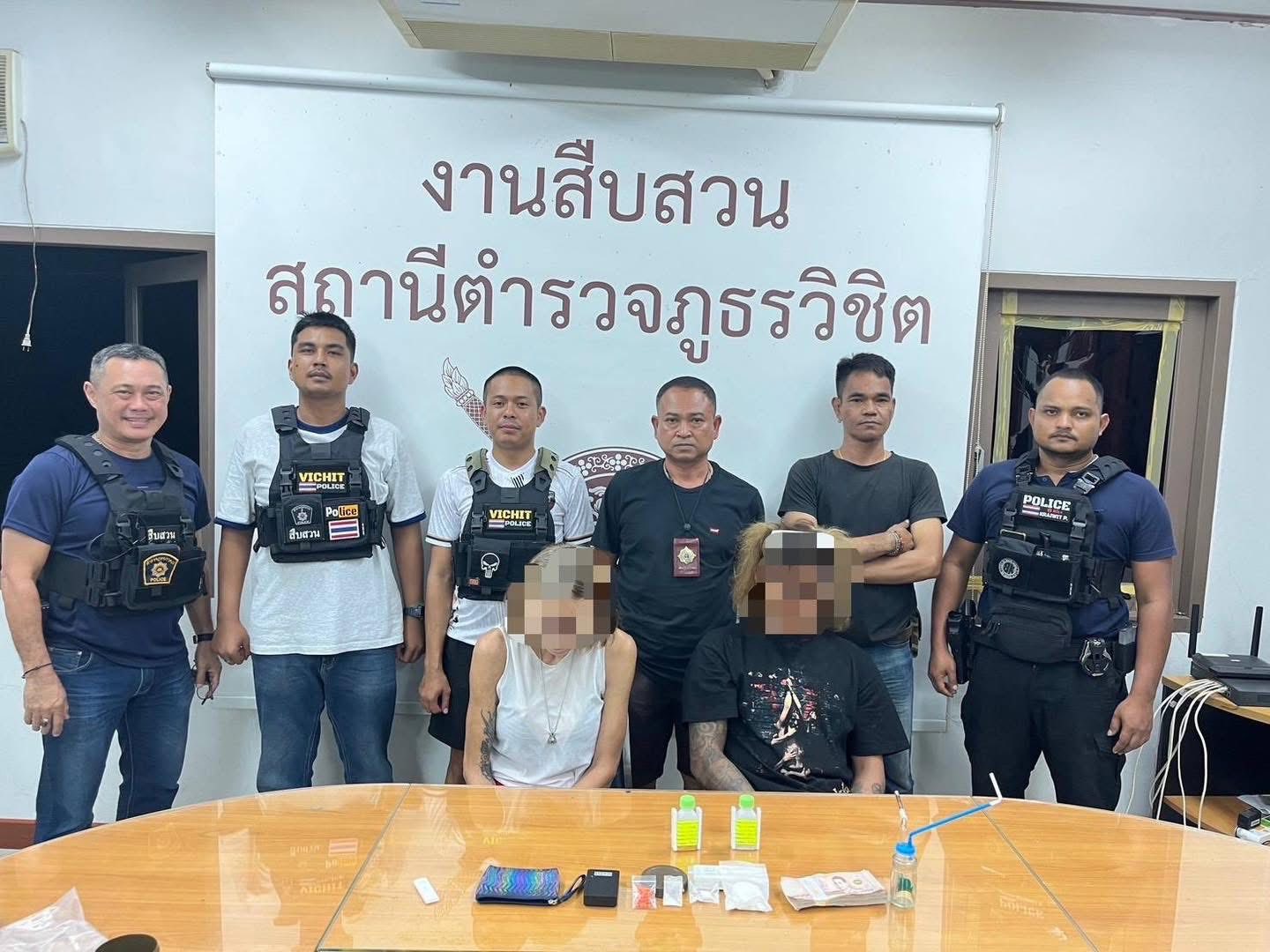 据泰国普吉媒体报道,当地时间12月7日21:30左右,泰国普吉府维吉警局侦查组突击搜查攀瓦岬一处豪华别墅,当场逮捕一名37岁泰国男子Kanon(化名)及一名54岁挪威籍女子Mette,并查获多种毒品及相关器具,涉嫌将别墅作为贩毒与吸毒场所。