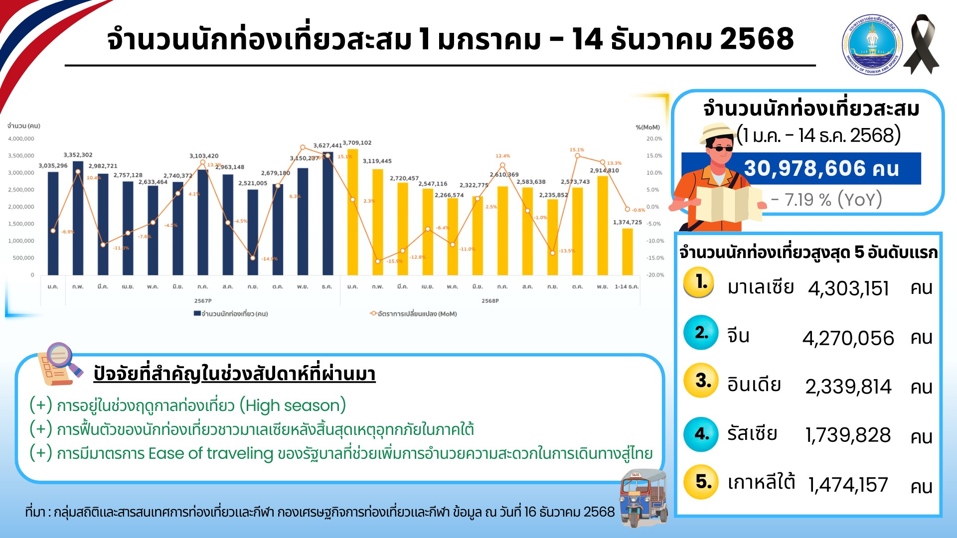 从全年累计情况看,自2025年1月1日至12月14日,泰国接待外国游客30,978,606人次,创造旅游收入约1.439875万亿泰铢。累计入境游客数量排名前五的国家依次为:马来西亚4,303,151人、中国4,270,056人、印度2,339,814人、俄罗斯1,739,828人和韩国1,474,157人。
